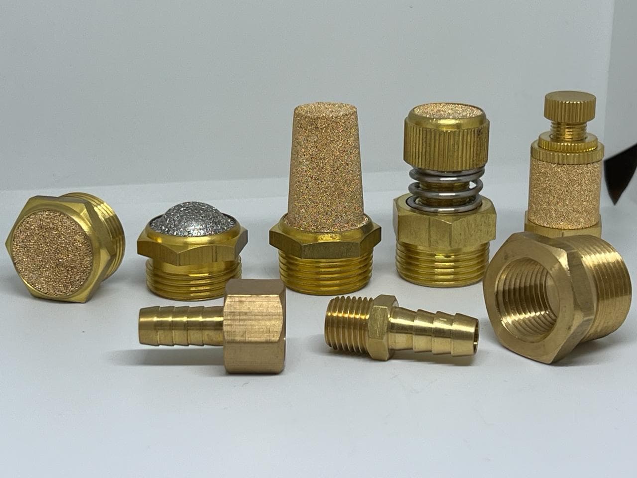 Silenciadores de bronce neumáticos, para las válvulas direccionales. Se manejan en forma cónica, planos, media luna y con regulador.