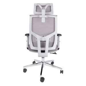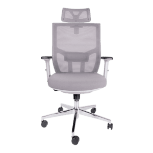 BASE: estrella de 5 puntas en acero cromado, rodajas tipo dual. ELEVACION: por medio de pistón neumático que permite ajustar la altura del asiento. MECANISMO: plato de acero reforzado con sistema de reclinación y palanca de bloqueo, perilla de regulación de tensión para el sistema de reclinación. BRAZOS: tipo 2D de polipropileno semi-rígido con pad de poliuretano negro; de 10 posiciones. RESPALDO: en malla de diseño ergonómico con soporte lumbar y cabecera. ASIENTO: hule espuma laminado flexible con densidad de 40 kgs/m3 y alta resilencia. TAPIZ: respaldo de malla de color gris y asiento en tela color gris. Peso máximo de resistencia: 150 kgs.