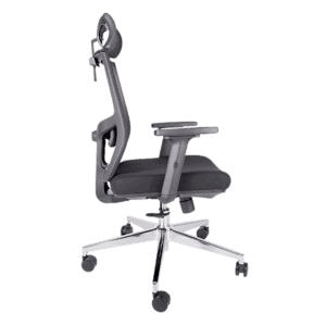 BASE: estrella de 5 puntas en acero cromado, rodajas tipo dual. ELEVACION: por medio de pistón neumático que permite ajustar la altura del asiento. MECANISMO: plato de acero reforzado con sistema de reclinación y palanca de bloqueo, perilla de regulación de tensión para el sistema de reclinación. BRAZOS: tipo 2D de polipropileno semi-rígido con pad de poliuretano negro; de 10 posiciones. RESPALDO: en malla de diseño ergonómico con soporte lumbar y cabecera. ASIENTO: hule espuma laminado flexible con densidad de 40 kgs/m3 y alta resilencia. TAPIZ: respaldo de malla de color gris y asiento en tela color gris. Peso máximo de resistencia: 150 kgs.
