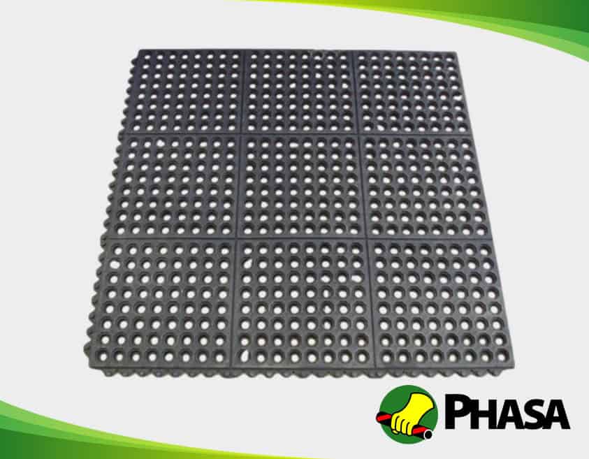 Tapetes de Hule Antifatiga. Dimensiones: 90cm x 90cm x 13mm Los tapetes de hule antifatiga son excelentes para prevenir lesiones en piernas y espalda debido a las jornadas largas de trabajo estando de pie. Los Tapetes de Hule Antifatiga tienen bordes para ensamblar tipo machihembrado, permitiendo cubrir el área que requiera el espacio. Son usados comúnmente en cocinas caseras e industriales. Gracias a su textura antiderrapante no tendrás accidentes en tu cocina debido a resbalones. También se usan en fabricas, líneas de producción y talleres para todo tipo de trabajo. El terminado de los tapetes de hule antifatiga es perforado por lo que permite filtrar líquidos de manera correcta.