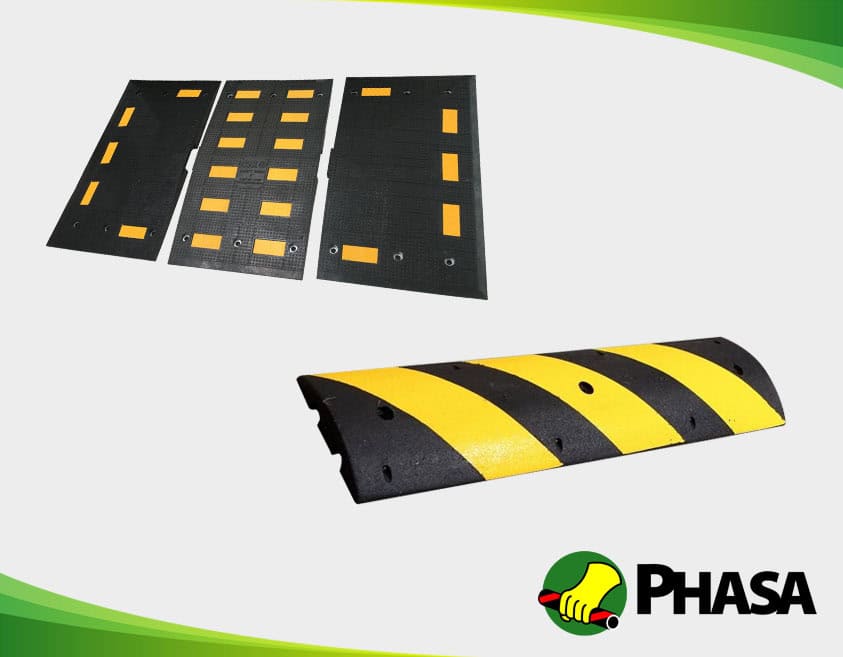 Nuestros topes de hule para intersecciones o Reductores de Velocidad son fabricados en hule muy resistente. Reducen la velocidad de los vehículos haciendo de los estacionamientos lugares más seguros para los peatones y motoristas. Son diseñados para ser instalados de forma inmediata. Su diseño flexible se adapta al contorno de cualquier superficie, además son muy visibles de noche, fáciles de instalar/recolocar de manera temporal o permanente, se puede instalar por secciones de diferentes largos. Es resistente a la luz ultravioleta, humedad, aceite y temperaturas extremas; tienen fondo acanalado para cableado o tubería, no requiere mantenimiento. Contamos con dos modelos: -Easy Rider (en la imagen): 1.83m largo X 30.5cm ancho X 5.7cm altura. Cabeceros opcionales: 23cm largo X 30.5cm ancho X 5.7cm altura -Safety Rider: 90 cm largo X 50 cm ancho X 5.7 cm altura. Ambos modelos son altamente visibles de día y de noche además de ser muy fáciles de instalar. PHASA es uno de los mayores distribuidores de reductores de velocidad en todo México.