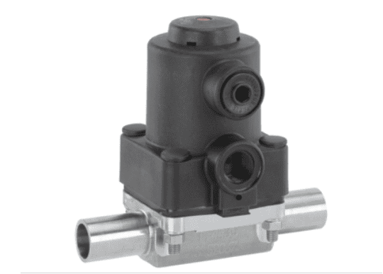 Válvula de diafragma GEMÜ 615 en metal, neumaticamente operada.