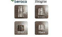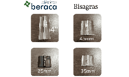 Se utiliza en la aplicación de puertas, ventanas, muebles, etc. Su acabado en acrílico permite que se puede aplicar en exhibidores y que la estética del exhibidor o mueble no se pierda. *Bisagra 35mm