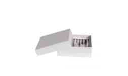 Caja criogénica de cartón con tapa integrada y divisiones de ABS. La tapa, la base y los cuatro lados presentan identificaciones alfanuméricas para una identificación de muestras individuales de