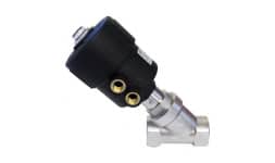 Válvulas neumáticas y de asiento inclinado operada neumáticamente en acero inoxidable y actuador resistente a la corrosión. Estas válvulas tienen alto flujo gracias a la configuración de asiento